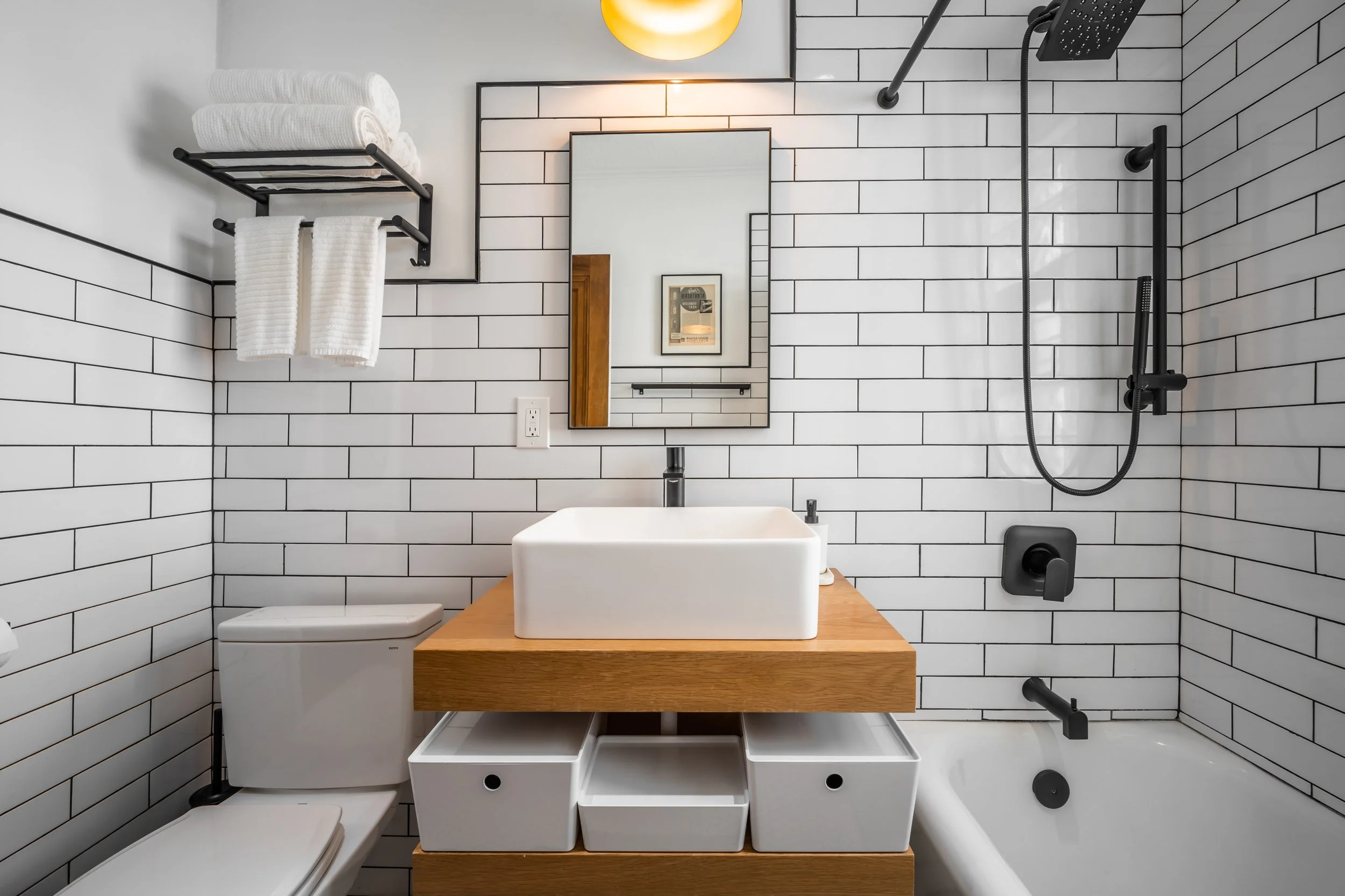 Bathroom Remodel in Rockford, IL. A young family hired us to make their bathroom more usable for their new child. It was a 100 year old house, so we worked to preserve the historic plaster as well as to add modern functionality. We did a full bathroom model including restoring the original tub and marble floors, new subway tile, subframing with Durock sheeting, new Kohler plumbing fixtures, new electric, hardware, and custom light fixtures.